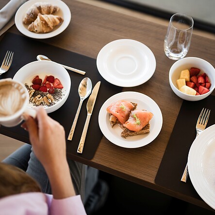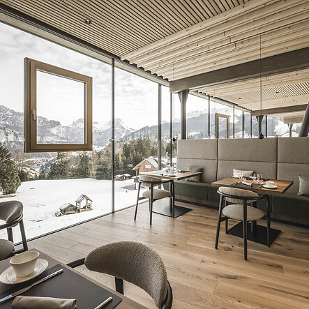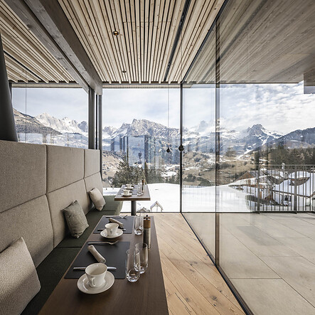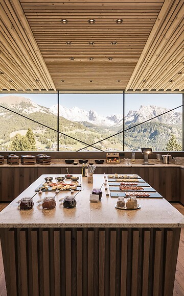 Rundumgenuss mit Rundumblick bietet sich mir in der neuen Panorama-Frühstückslounge mit Blick auf die Grödner Bergwelt. Jeden Tag suche ich mir neue, regionale und hochwertige Naturprodukte aus, in der Showküche werden köstliche Frühstücksgerichte direkt vor meinen Augen frisch zubereitet und während ich genieße, nehme ich die atemberaubende 360°-Aussicht auf die Gipfel der Dolomiten in mich auf.