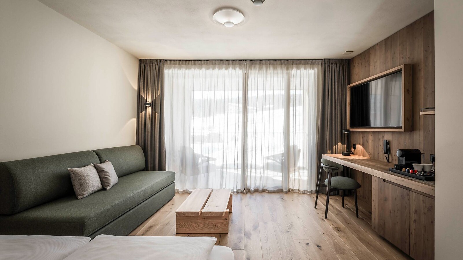 Regionale und naturbelassene Materialien erzeugen ein warmes und angenehmes Raumklima. Die Farbwahl der Einrichtung setzt sich über die große Glasfassade in unserer Umgebung fort.