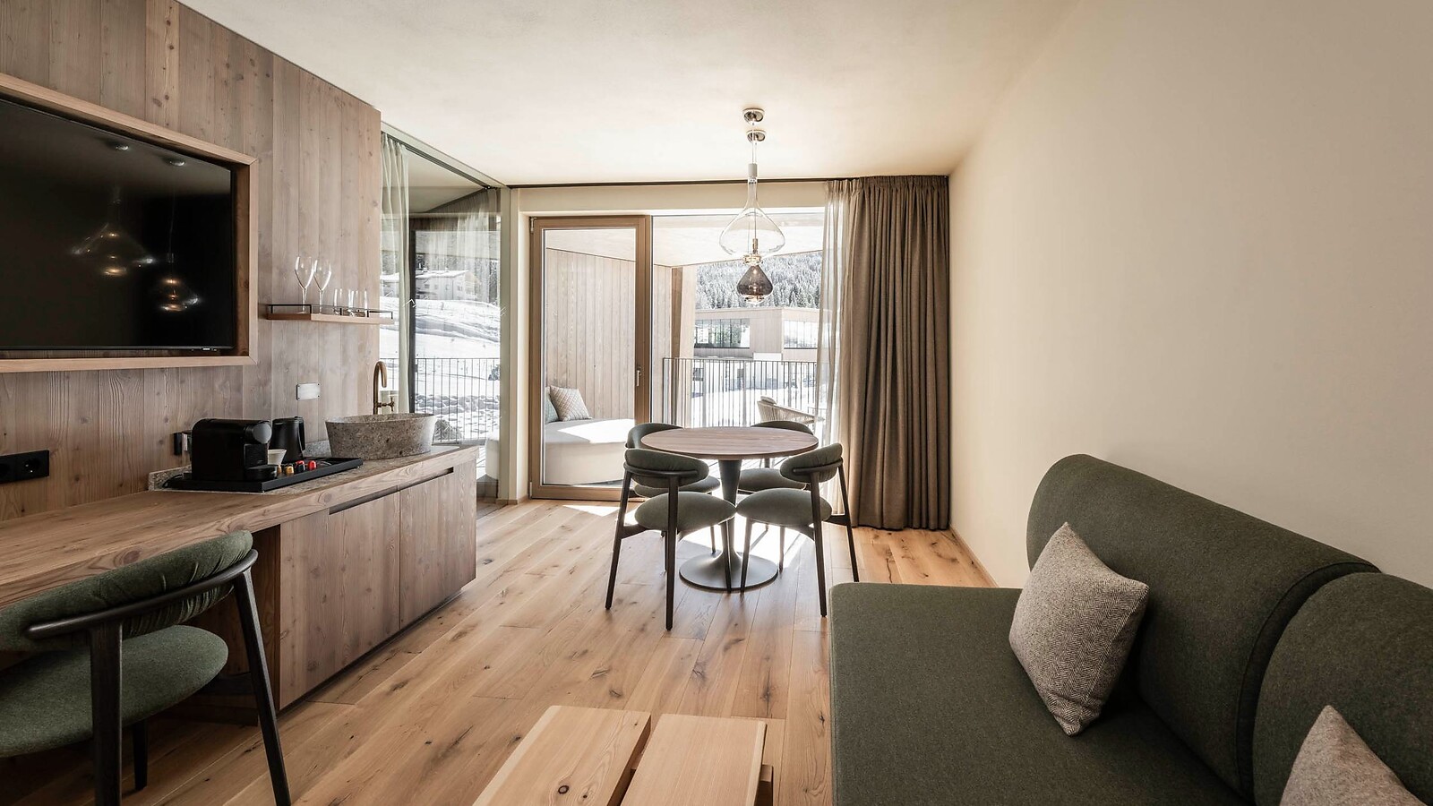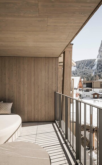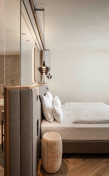 Diese großzügige Suite bietet sehr viel Platz für einen erholsamen und unvergesslichen Aufenthalt. Die deckenhohe Glasfassade sorgt für lichtdurchflutete Räumlichkeiten und eine spektakuläre Aussicht auf unseren Erlebnisgarten und das Langkofelmassiv.