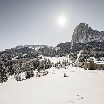 Sassolungo, Sasso Piatto, Stevia, Seceda, Sella, Sass Rigais peaks: what a privilege to stay in a place where the most beautiful mountain range in the world towers majestically in front of me. My panorama hotel in the Dolomites is located on the high plateau of Monte Pana between Santa Cristina and the Alpe di Siusi. All around there are only meadows, forests and mountain scenery. In this liberating, secluded location, I can enjoy maximum privacy and panoramic views from morning to night.