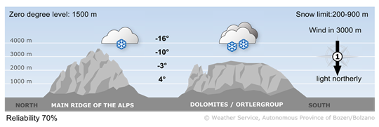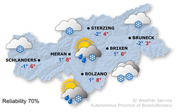 Very cloudy or overcast skies with light snowfall arriving from the south. Snow line between the valley floor and 1000 m. In the east and the upper Vinschgau, precipitation will begin later than in other areas of the region. Widespread precipitation overnight.