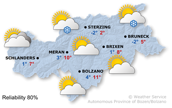 Cold and partly stormy north wind. As the day progresses, the snowfall will be confined to the main Alpine ridge. Heaviest snowfall between the Brenner Pass and the Staller Sattel.