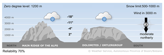 The day will begin with many clouds and some snowfall. The snow line will rise up to 500/1000 m altitude. In the course of the day, the precipitation will clear up starting in the west and some clearing up will arrive locally.