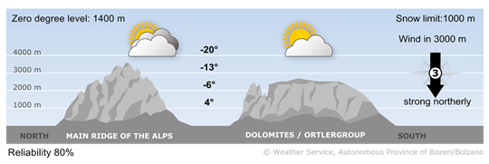 Wednesday will be quite sunny. More clouds along the border with Austria. In many valleys northerly foehn winds.