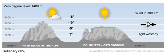 Throughout South Tyrol, the sun will shine from early to late and the sky is often cloudless. The north wind weakens as the day progresses.