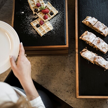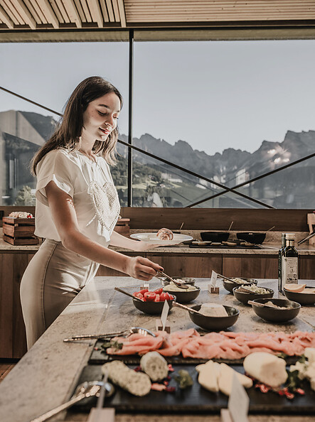 Nella nuova Panorama Breakfast Lounge, con affaccio sul magnifico paesaggio montano della Val Gardena, mi attende un’esperienza di piacere a 360°. Ogni giorno posso scegliere tra prodotti naturali, regionali e di alta qualità. Nella show kitchen, deliziose specialità per la colazione vengono preparate al momento, proprio davanti ai miei occhi. E mentre assaporo il tutto, mi lascio catturare dall’incantevole vista a 360° sulle vette delle Dolomiti.