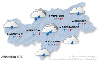 Temperature massime tra 18° a Vipiteno e 24° a Bolzano.