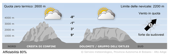 In montagna la visibilità sarà spesso ridotta dalle nubi. Solo localmente ci saranno tratti soleggiati. Temperature in lieve calo. In serata saranno possibili locali precipitazioni, nevose oltre 2200 m di quota.