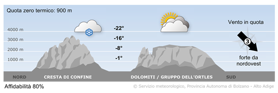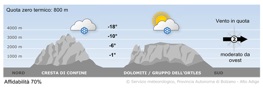 A nord il cielo sarà molto nuvoloso con deboli nevicate a tratti sulla cresta di confine. Sui gruppi meridionali, soprattutto sulle Dolomiti, ci saranno delle schiarite.