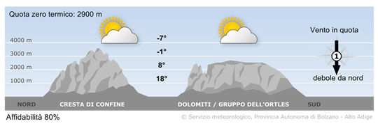 Sui monti altoatesini splenderà spesso il sole con qualche cumulo. La probabilità di rovesci rimarrà bassa e le temperature saranno in ulteriore lieve aumento.
