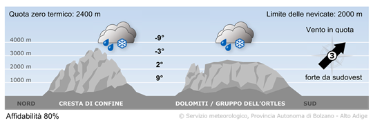 Nubi e nebbie ostacoleranno la visibilità. Nel pomeriggio, a partire da sud, inizierà a piovere e nevicare. Limite della neve sui 2000 m.